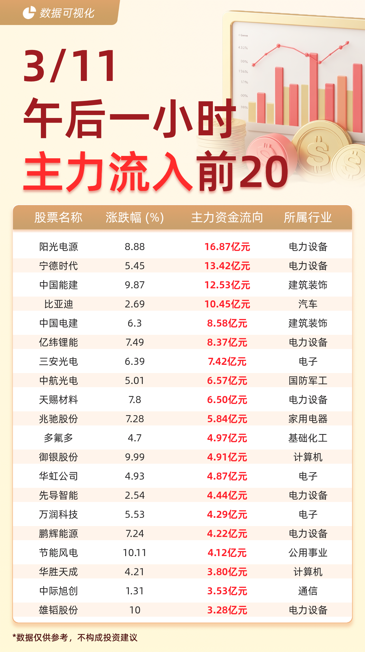 据交易所数据显示,截至3月11日午后一小时,主力资金流入前20的股票分别为:阳光电源(16.87亿元)、宁德时代(13.42亿元)、中国能建(12.53亿元)、比亚迪(10.45亿元)、中国电建(8.58亿元)、亿纬锂能(8.37亿元)、三安光电(7.42亿元)、中航光电(6.57亿元)、天赐材料(6.50亿元)、兆驰股份(5.84亿元)、多氟多(4.97亿元)、御银股份(4.91亿元)、华虹公司(4.87亿元)、先导智能(4.44亿元)、万润科技(4.29亿元)、鹏辉能源(4.22亿元)、节能风电(4.12亿元)、华胜天成(3.80亿元)、中际旭创(3.53亿元)、雄韬股份(3.28亿元)。