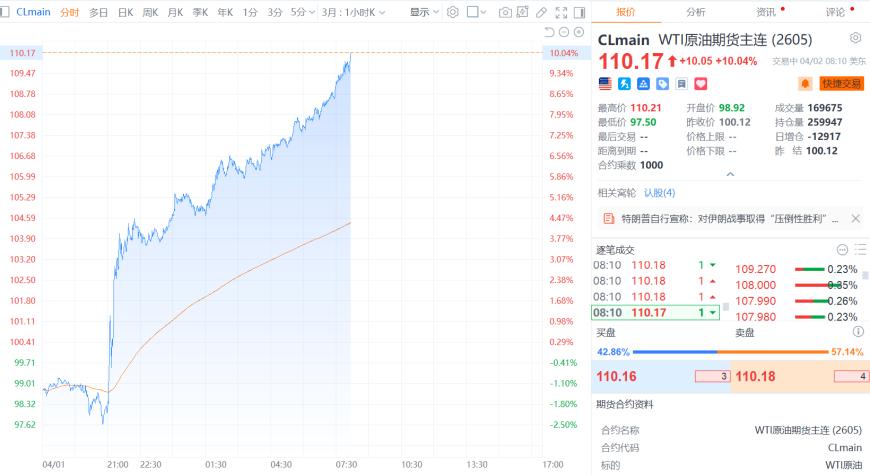 美国原油期货扩大涨幅至10% 升破每桶110美元