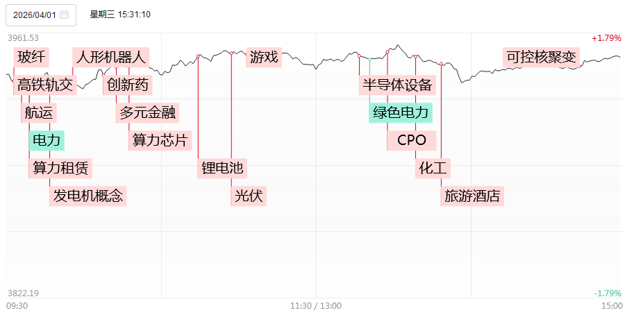 4月1日,市场高开震荡,三大指数均涨超1%,科创50指数涨超3%。截至收盘,沪指涨1.46%,深成指涨1.7%,创业板指涨1.96%。沪深两市成交额2.01万亿,较上一个交易日放量199亿。盘面上,