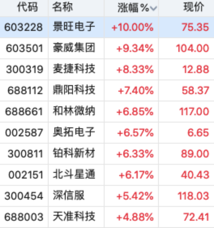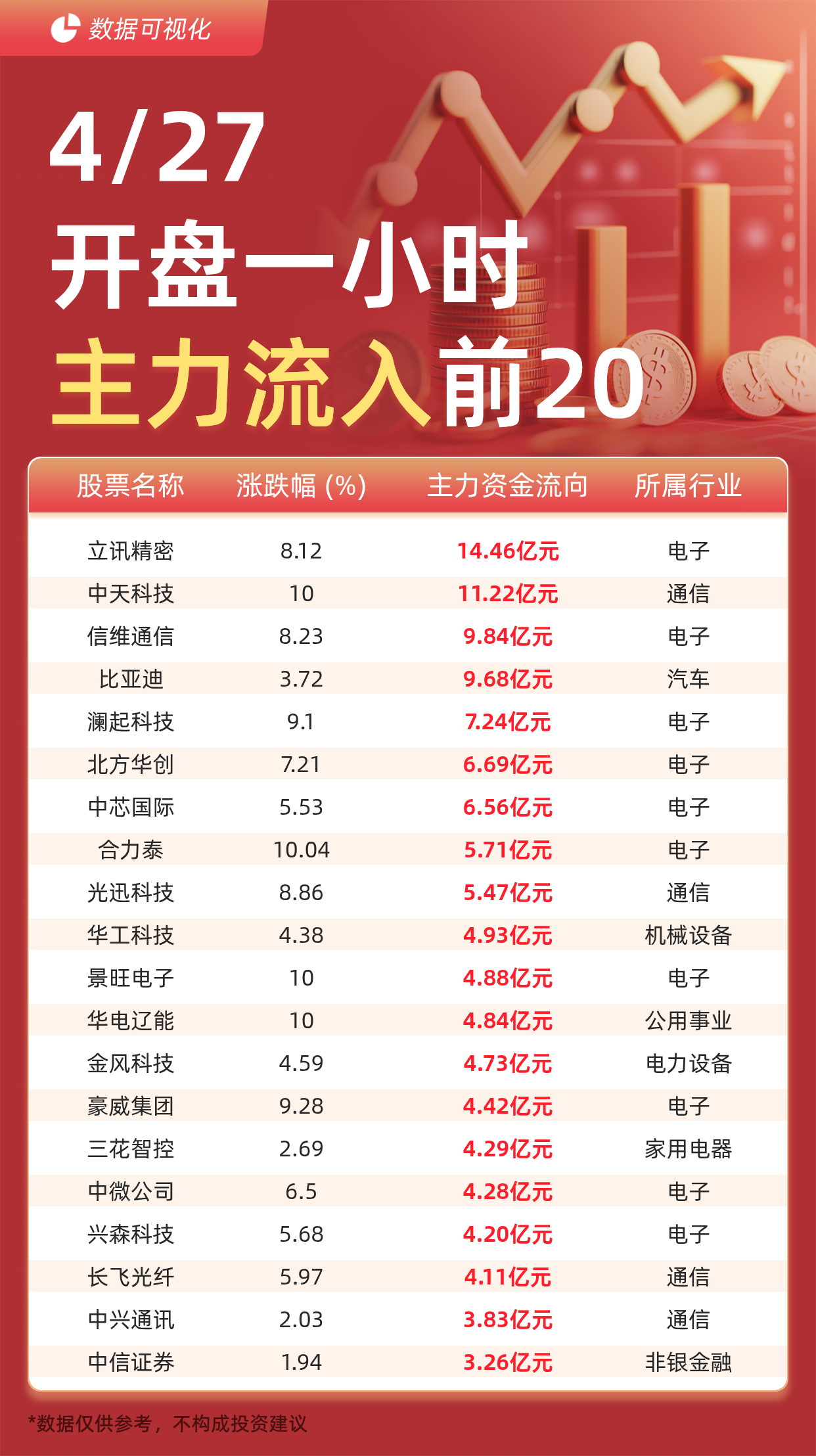 据交易所数据显示,截至4月27日开盘一小时,主力资金流入前20的股票分别为:立讯精密(14.46亿元)、中天科技(11.22亿元)、信维通信(9.84亿元)、比亚迪(9.68亿元)、澜起科技(7.24亿元)、北方华创(6.69亿元)、中芯国际(6.56亿元)、合力泰(5.71亿元)、光迅科技(5.47亿元)、华工科技(4.93亿元)、景旺电子(4.88亿元)、华电辽能(4.84亿元)、金风科技(4.73亿元)、豪威集团(4.42亿元)、三花智控(4.29亿元)、中微公司(4.28亿元)、兴森科技(4.20亿元)、长飞光纤(4.11亿元)、中兴通讯(3.83亿元)、中信证券(3.26亿元)。
