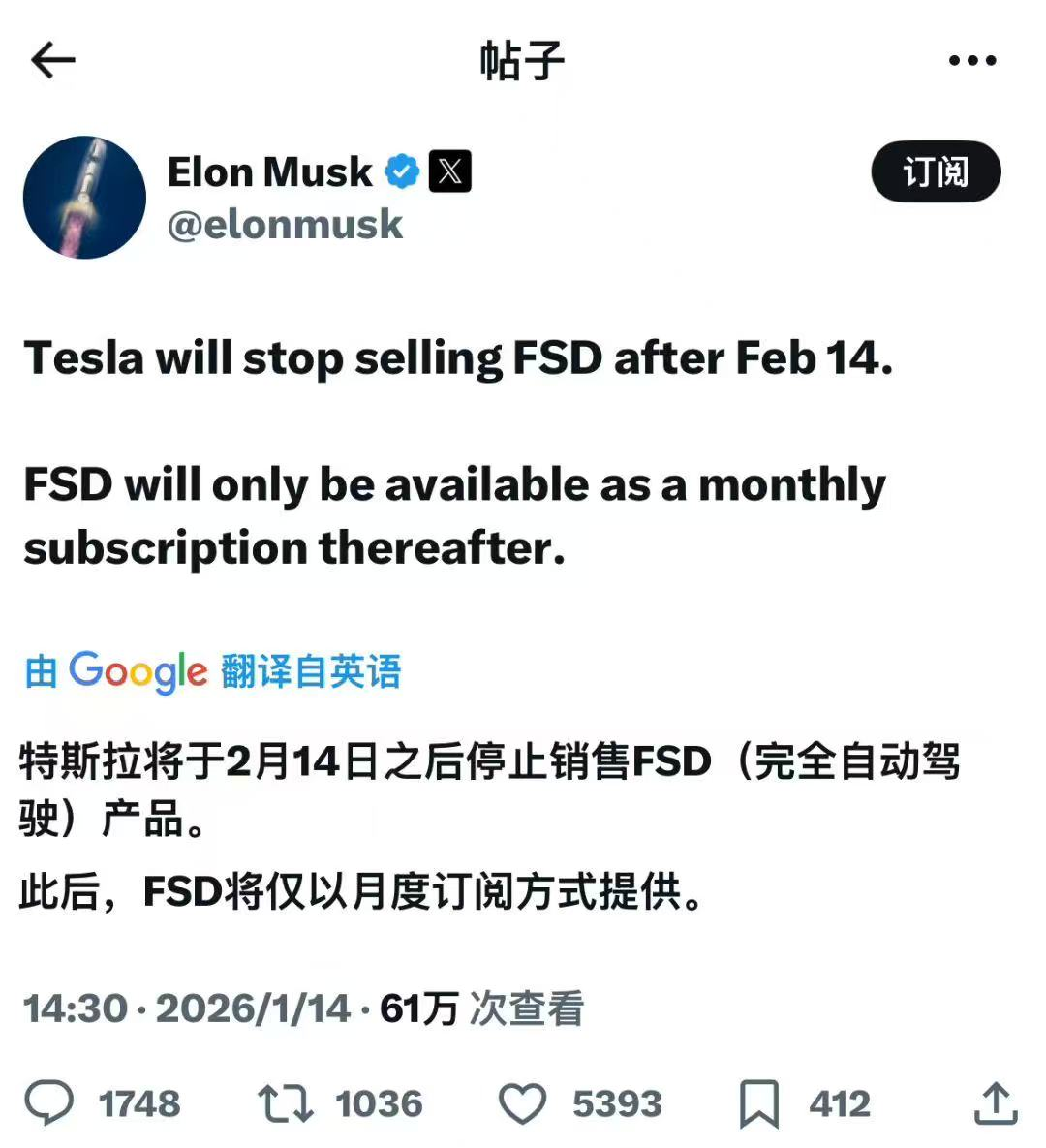 1月14日,特斯拉CEO马斯克在社交平台X上发帖称,特斯拉将于2月14日之后停止销售FSD(完全自动驾驶)产品。此后,FSD将仅以月度订阅方式提供。对于订阅价格,目前,特斯拉美国官网显示,FSD一次