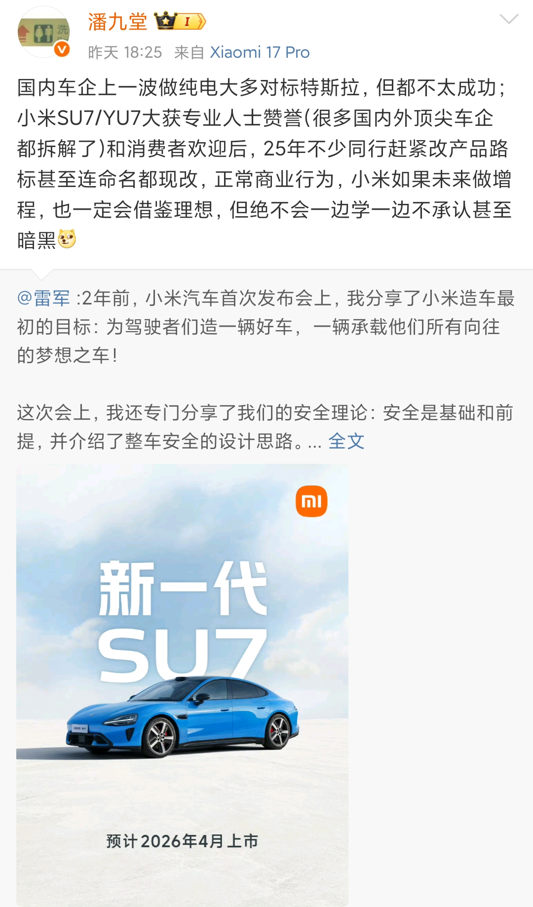近日,小米产业投资部合伙人潘九堂在社交媒体发文称:“小米如果未来做增程,也一定会借鉴理想,但绝不会一边学一边不承认甚至暗黑。”这段话是潘九堂转发雷军微博时所说,此前雷军曾发文称:“Model Y挺强