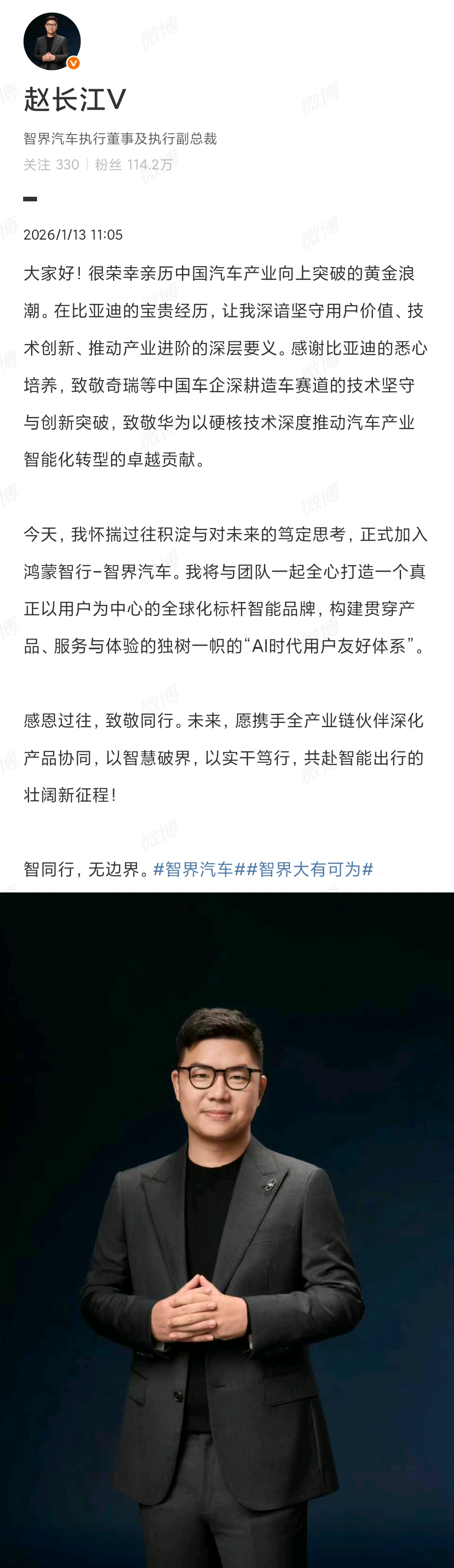 在离职约三个月后,前比亚迪腾势汽车总经理赵长江的去向终于确定。1月13日,赵长江发微博宣布,自己正式加入智界汽车,担任执行董事及执行副总裁。智界汽车是奇瑞与华为共同打造的高端新能源品牌,是鸿蒙智行“