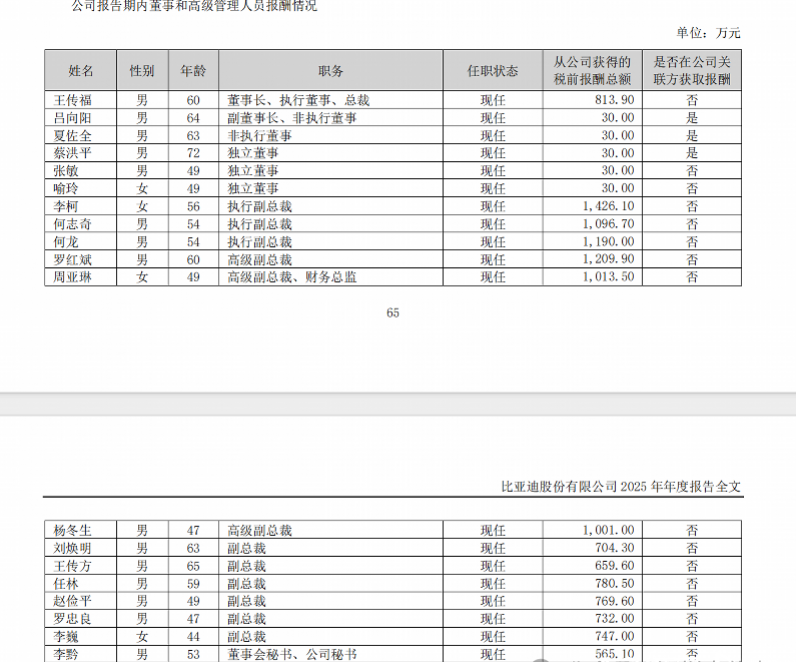 日前,比亚迪(002594.SZ)发布2025年年度报告,其中高管薪酬引发市场广泛关注。年报显示,公司执行副总裁李柯以1426.1万元年薪居首,何志奇、何龙、罗红斌、杨冬生等多名高管薪酬均突破千万元