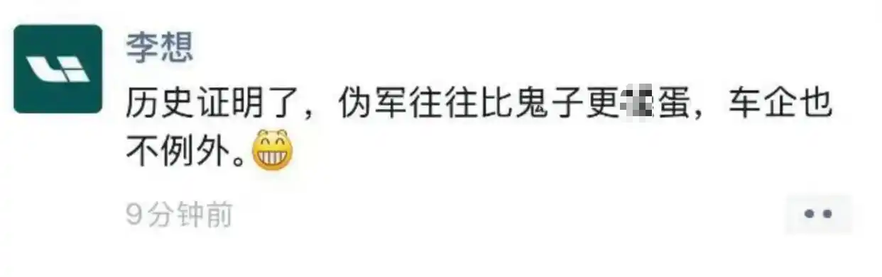 4月11日,理想汽车CEO李想在朋友圈炮轰某日系车企称:“历史证明了。伪军往往比鬼子更**,车企也不例外。”他随后又发了一条朋友圈表示“最近,某日系品牌,大量雇佣[营销号]对我们的产品进行[拉踩],