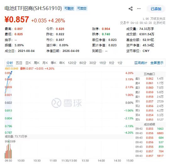 4月10日早盘,新能源板块强势爆发。截至9时45分,电池ETF招商(561910)放量大涨4.50%,权重股集体飙升——阳光电源大涨6.15%,宁德时代涨3.47%,三花智控涨1.92%,市场做多情
