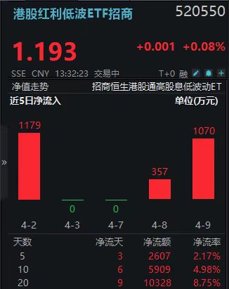 4月10日,南向资金连续第2日净流入,港股红利资产再获资金青睐。截至13时50分,港股红利低波ETF招商(520550)上涨0.17%,资金热度不减。截至4月9日,该基金近5个交易日已3度录得净流入