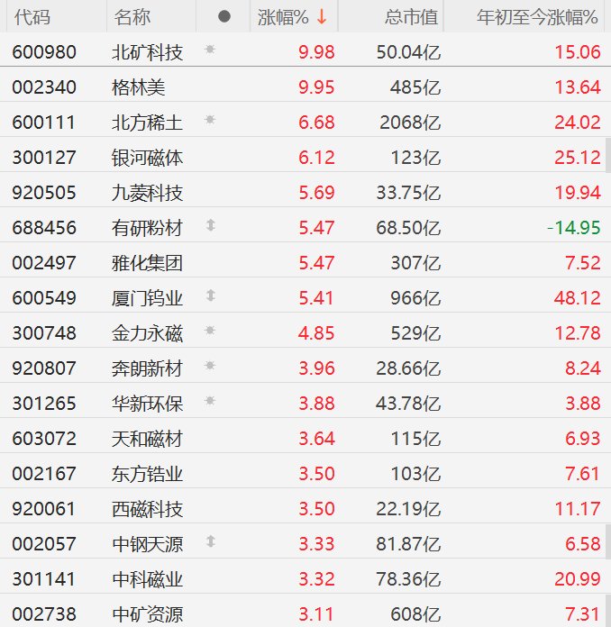 主流产品价格整体上行!稀土股集体走强,北方稀土、银河磁体涨超6%