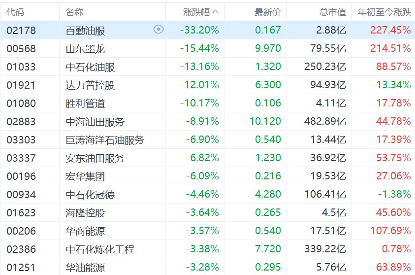 港股油气设备与服务股连涨两日后回调,百勤油服跌超33%,山东墨龙跌超15%