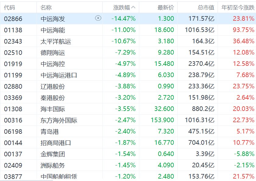 港口航运股集体回调,中远海发跌超14%