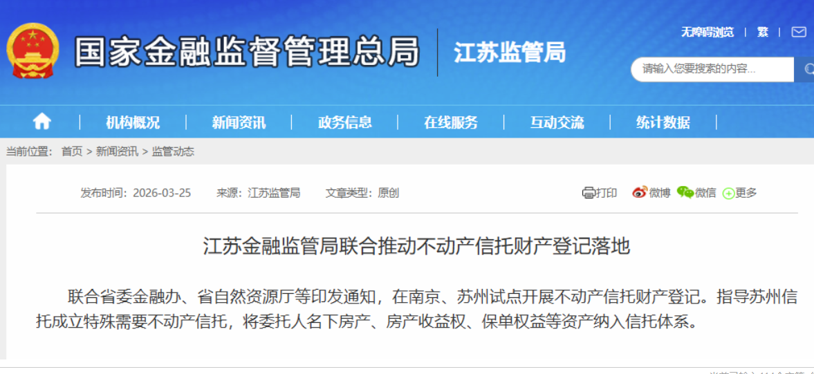 江苏金融监管局联合推动不动产信托财产登记落地 指导苏州信托成立特殊需要不动产信托