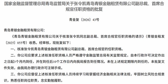 青岛青银金融租赁:张令凯副总裁、首席合规官任职资格获批