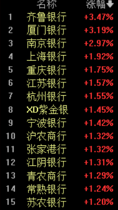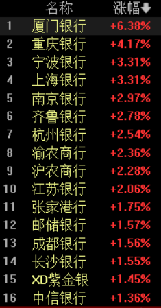 银行股逆势上涨,厦门银行涨超6%,重庆银行涨超4%