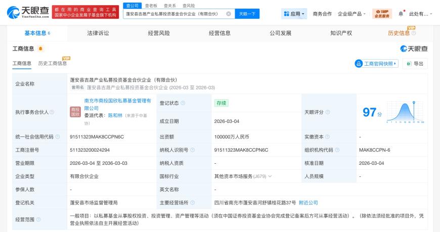 蓬安县吉晟产业私募基金登记成立 出资额10亿