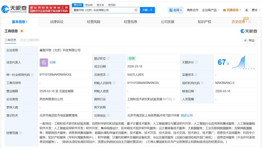科大讯飞等在北京成立量智开物科技公司 注册资本500万