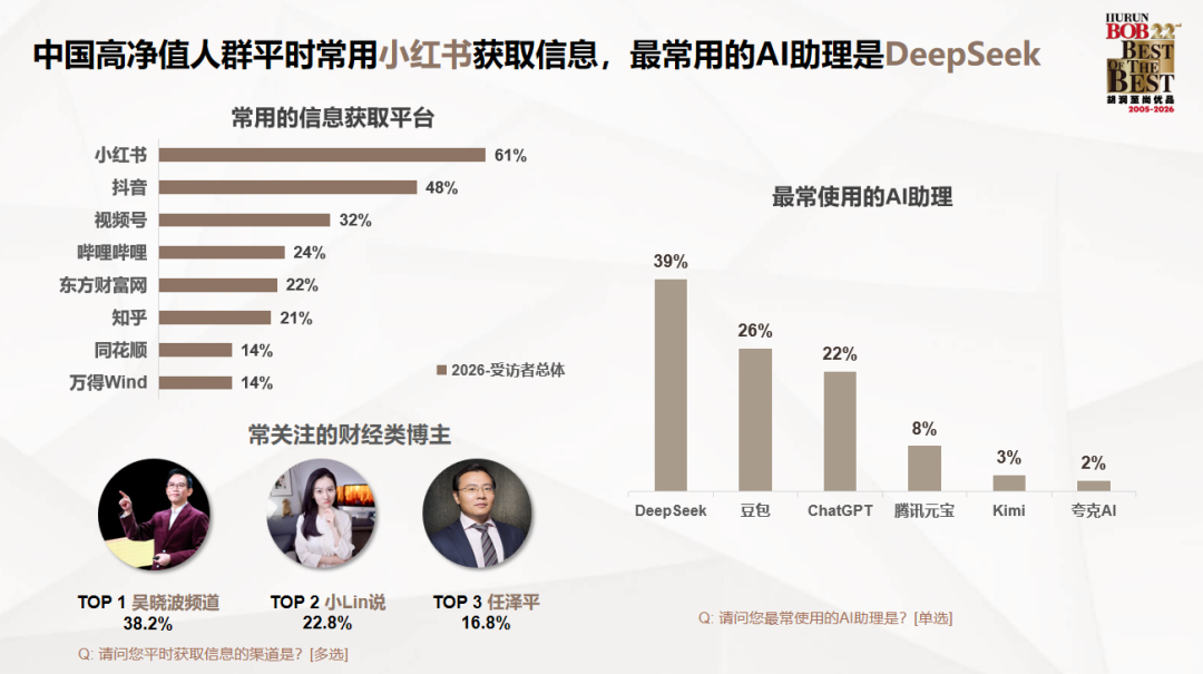 胡润报告:高净值人群常用信息获取平台是小红书和抖音,最常关注财经博主前三名是吴晓波频道、小Lin说和任泽平