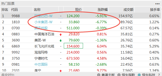 港股科网股持续疲软,恒生科技指数跌超2%,小米跌7%,阿里跌超6%