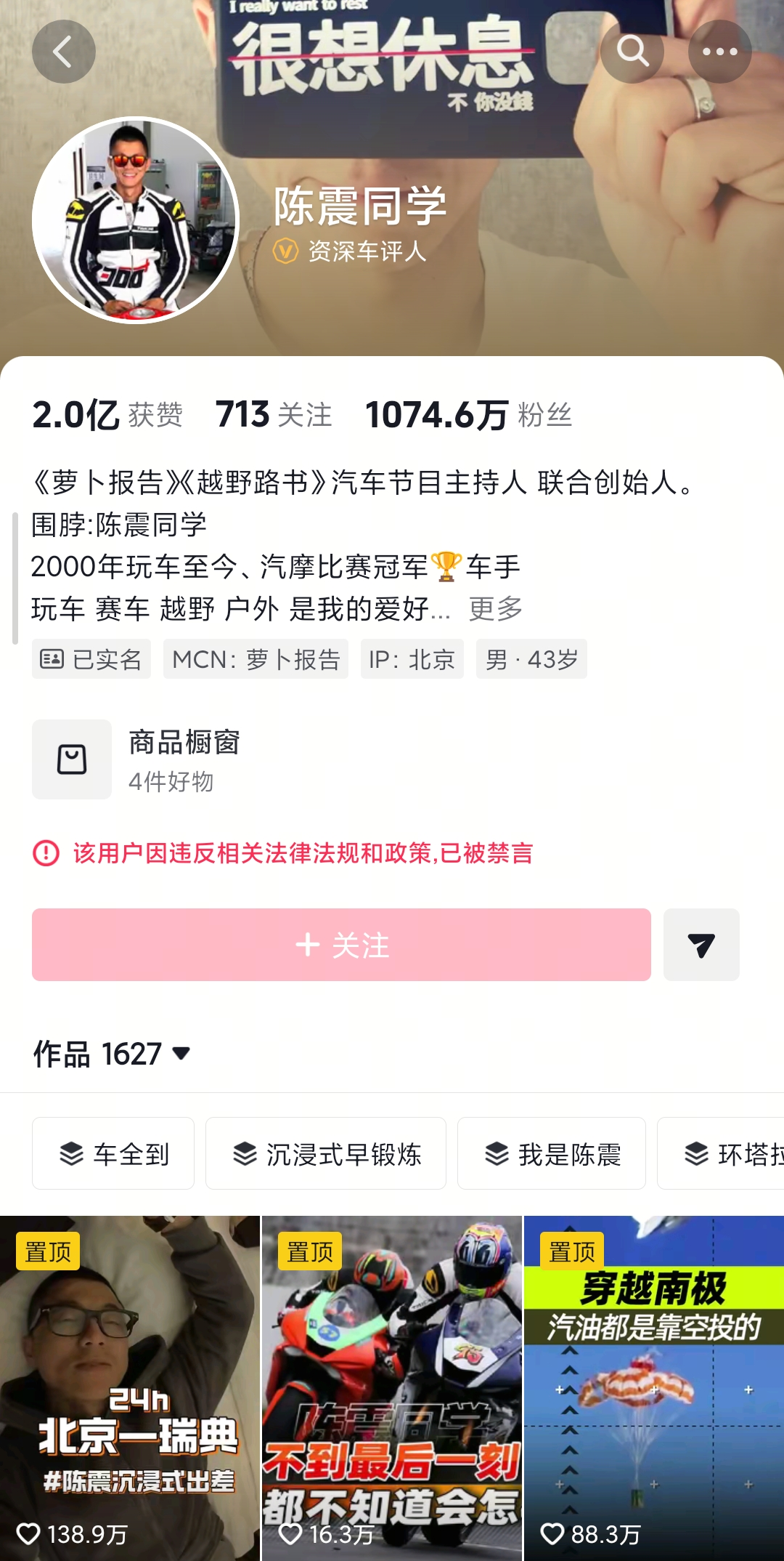 知名车评人陈震被禁言,超2400万粉丝账号一夜停摆