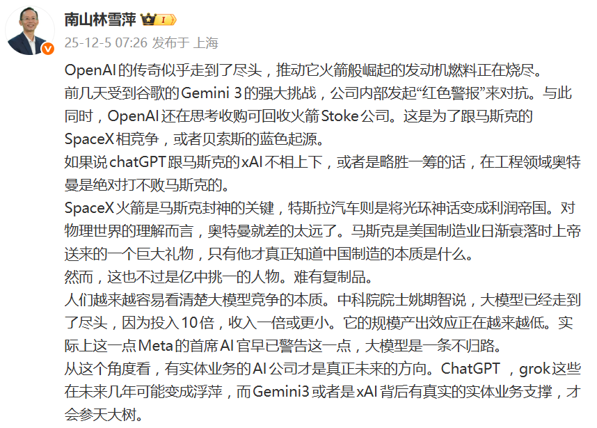 林雪萍:OpenAI的传奇似乎走到了尽头,也许就在未来两年会变得一文不值