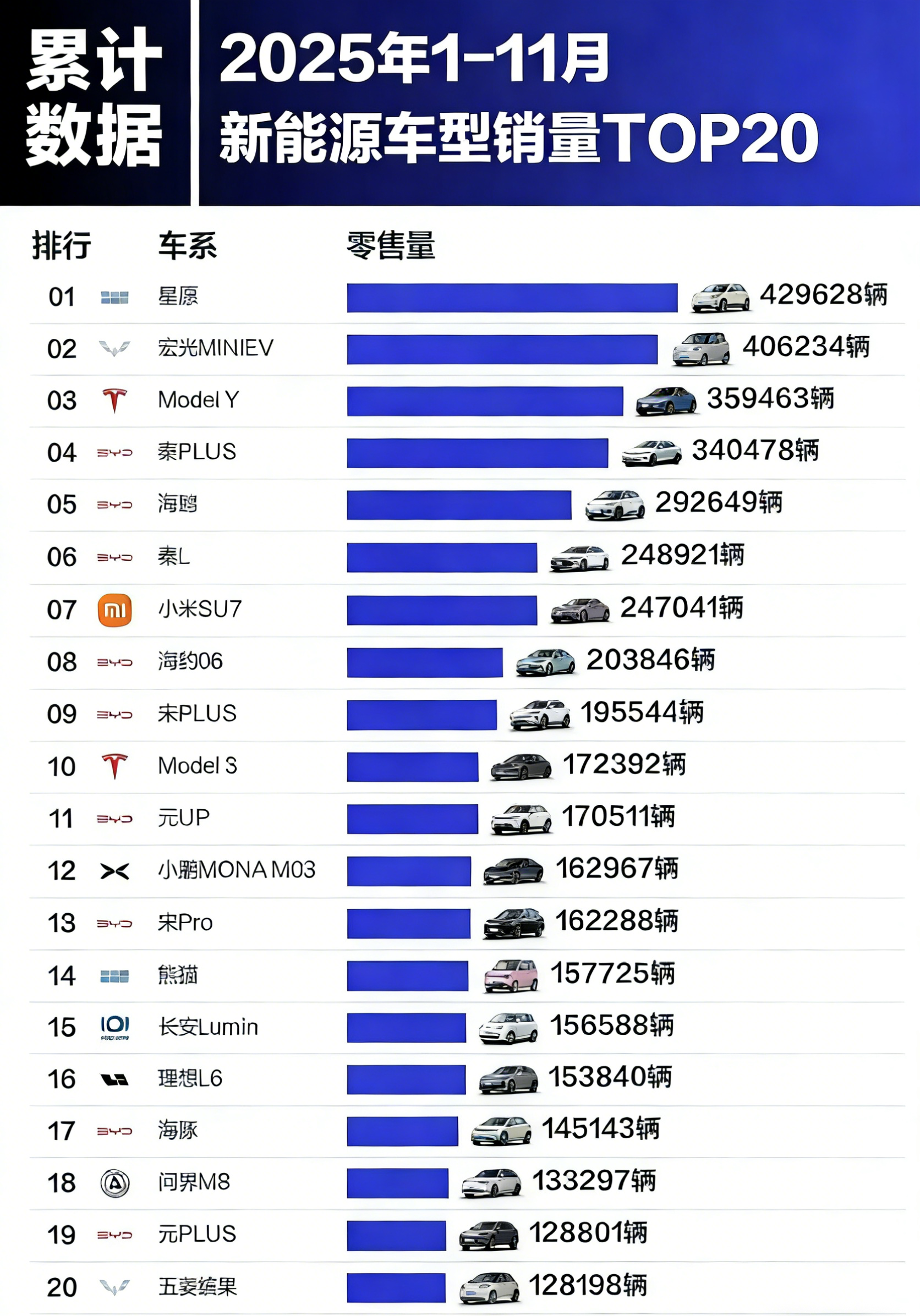 1-11月新能源车销量TOP20出炉,吉利星愿第一,小米SU7上榜