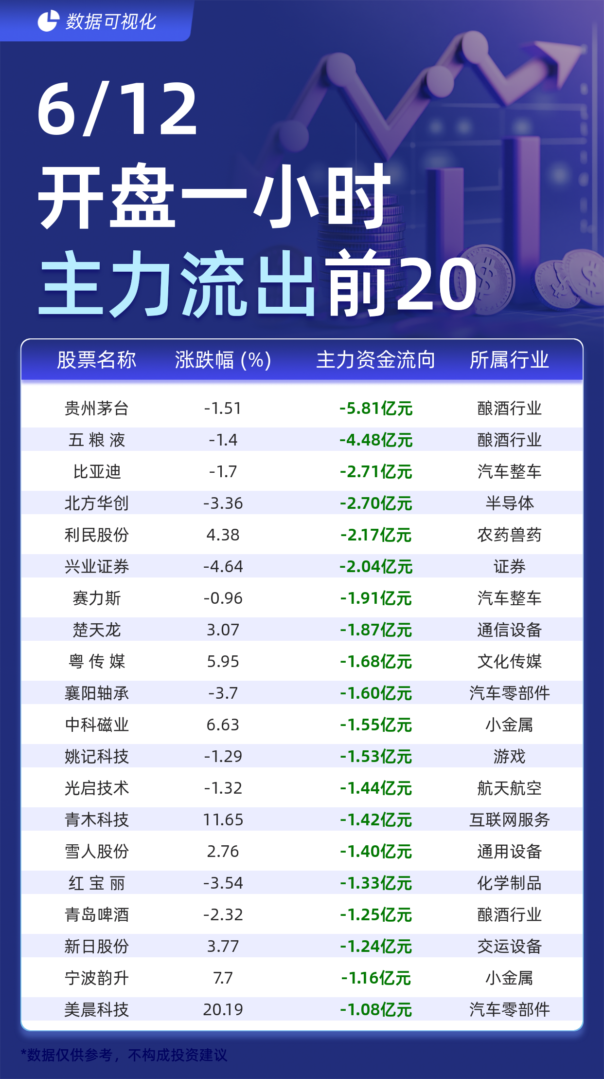 截至6月12日开盘一小时,主力资金流出前20的股票分别为:贵州茅台(-5.81亿元)、五 粮 液(-4.48亿元)、比亚迪(-2.71亿元)、北方华创(-2.70亿元)、利民股份(-2.17亿元)、兴业证券(-2.04亿元)、赛力斯(-1.91亿元)、楚天龙(-1.87亿元)、粤 传 媒(-1.68亿元)、襄阳轴承(-1.60亿元)、中科磁业(-1.55亿元)、姚记科技(-1.53亿元)、光启技术(-1.44亿元)、青木科技(-1.42亿元)、雪人股份(-1.40亿元)、红 宝 丽(-1.33亿元)、青岛啤酒(-1.25亿元)、新日股份(-1.24亿元)、宁波韵升(-1.16亿元)、美晨科技(-1.08亿元)。