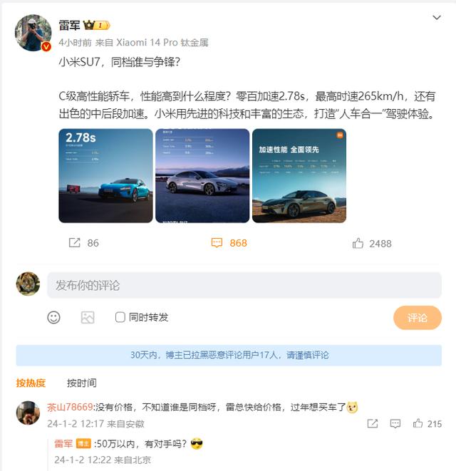 小米创办人、董事长兼CEO雷军1月2日在微博发文称,“小米SU7,同档谁与争锋?”对此网友称不知道同档对手是谁,并催促雷军尽快公布小米汽车售价,对此雷军回应称:“50万以内,有对手吗?”