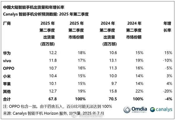 从市场调研机构Canalys发布的2025年第二季度中国大陆智能手机市场报告显示,2025年Q2中国大陆智能手机出货量为6780万台,同比下滑4%。市场前五的厂商依次为华为、vivo、OPPO、小米、苹果,不见三星身影。