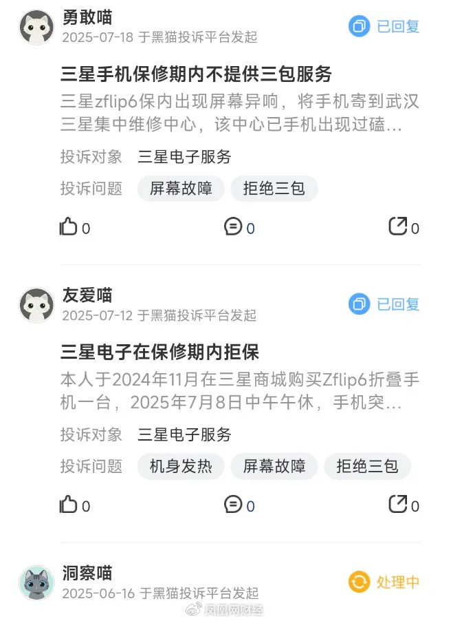 多位三星手机用户反映产品存在严重质量问题。据消费者投诉,售价4000元起的三星S23系列存在异常发热、续航差等问题,有用户称,“三星手机导航15分钟耗电20%”。更令消费者不满的是售后态度,有三星S24 Ultra用户反映新机出现信号问题,售后仅同意拆机维修拒绝换新。多位用户表示,三星手机品控下滑严重,8000元旗舰机使用两个月就需维修,售后却以“过换机期”为由推诿。目前,相关投诉在社交平台持续发酵,消费者呼吁三星正视问题。在黑猫投诉平台上,有3400多条关于三星手机的诉求,多涉及手机故障、不提供三包服务、保修期内拒保等问题。