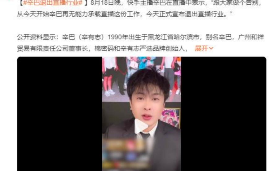 “跟大家做个告别,从今天开始辛巴再无能力承载直播这份工作,今天正式宣布退出直播行业。”8 月18日晚间,快手顶流主播辛巴(辛有志)在“818粉丝节”直播中宣布永久退出直播行业。