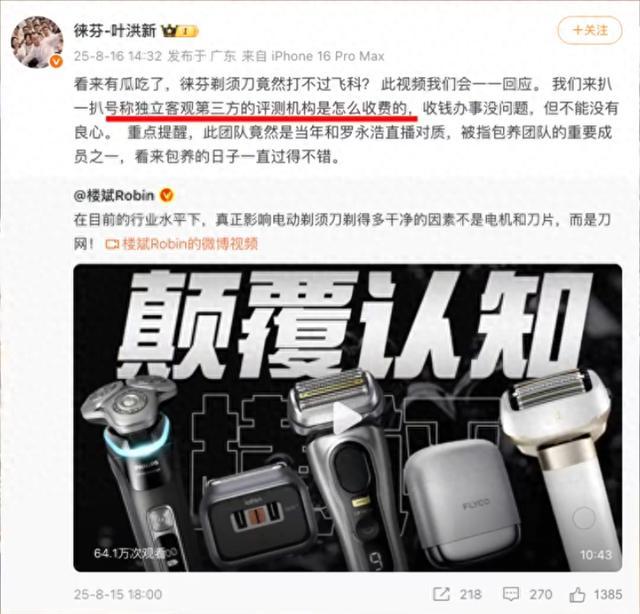 几小时后,叶洪新微博转发开炮,火力全开:“有瓜吃了!扒一扒独立评测怎么收费的!收钱可以,不能没良心!”更在评论区点名博主哥哥、徕芬前员工潘坚,质疑评测公正性的同时,直指其“收钱办事没良心”,暗示评测背后暗藏利益输送。