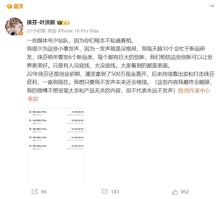 潘坚火速反击,怒斥叶洪新曾承诺其上市前5%股权(据潘坚估算估值过亿),最终仅以500万现金补偿,指责叶洪新“用部分事实带节奏”。
