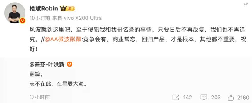8月18日凌晨剧情急转,叶洪新突然发文“翻篇,志不在此,在星辰大海”,疑似终止骂战。潘坚转发回应“回归产品才是根本”,博主楼斌也称“不再追究”。
