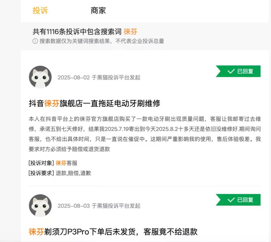 质量问题是徕芬最直观的危机。今年3月,江苏省东台市市场监管局抽查显示,徕芬吹风机因安全指标不达标被点名;黑猫投诉平台上,关于徕芬的投诉高达千条,多为外壳漏电、胶臭糊味、机壳开裂、机体发烫冒烟等质量问题,电动牙刷也出现失灵、无法充电等故障。