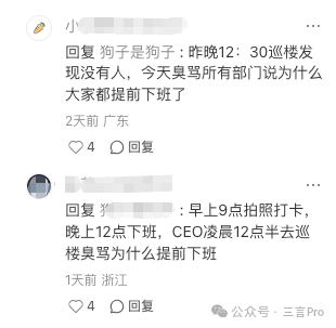 近日有网友爆料,钉钉CEO“无招”在晚上12点至12点半之间,巡查了一趟办公区域,发现工位上没几个人。第二天,他把所有部门都批评(臭骂)了一番,质问大家:为什么提前下班?