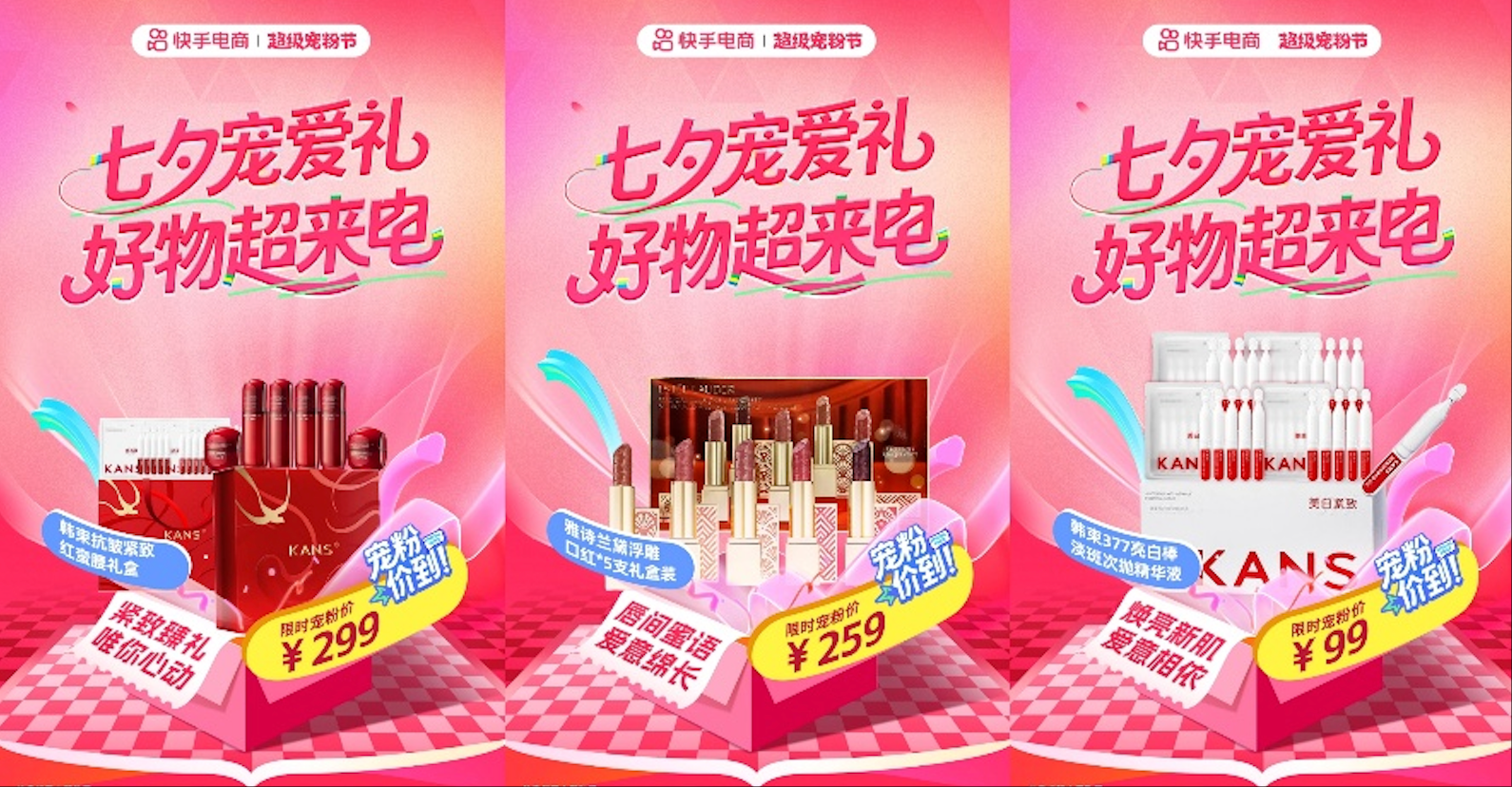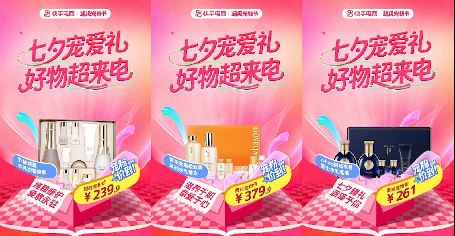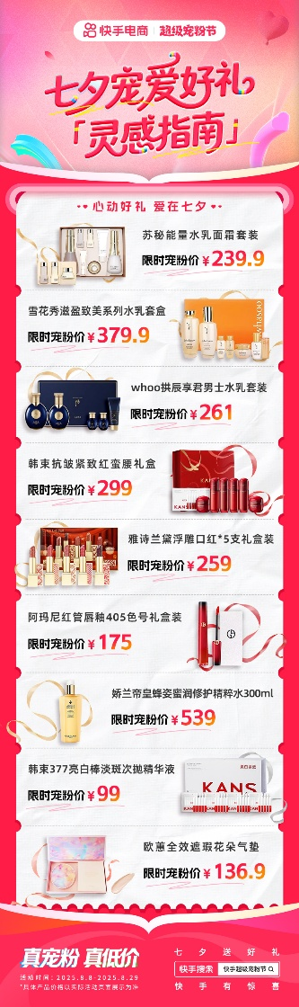 七夕宠爱礼品类日期间,快手电商以超值宠粉价带来一系列重磅好礼,苏秘能量水乳面霜套装、雪花秀滋盈致美系列水乳套盒、whoo拱辰享君男士水乳套装、韩束抗皱紧致红蛮腰礼盒、雅诗兰黛浮雕口红礼盒、阿玛尼红管唇釉405色号礼盒等大牌好礼限时热卖。