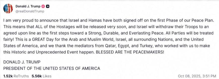 新华社北京10月9日电美国东部时间8日傍晚,美国总统特朗普在社交媒体发文宣布,以色列和巴勒斯坦伊斯兰抵抗运动(哈马斯)已经同意美方所提“和平计划”的第一阶段。这意味着所有以方被扣押人员将很快获释,以色列军队也将撤回至双方商定的界线。