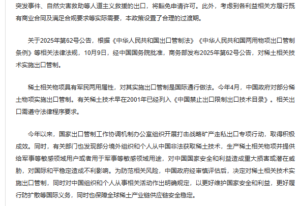 关于2025年第62号公告,根据《中华人民共和国出口管制法》《中华人民共和国两用物项出口管制条例》等相关法律法规,10月9日,经中国国务院批准,商务部发布2025年第62号公告,对稀土相关技术实施出口管制。