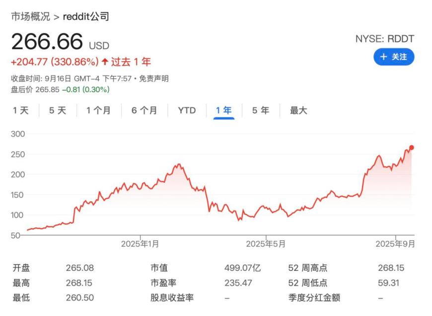 2024 年 3 月,在我们报道 Reddit 上市文章时,Reddit 股票是约 50 美元一股,一年半后,Reddit 股价翻了五倍,超过了 250 美元/一股(截稿时已达 266.66 美元/股),市值接近 500 亿美元。