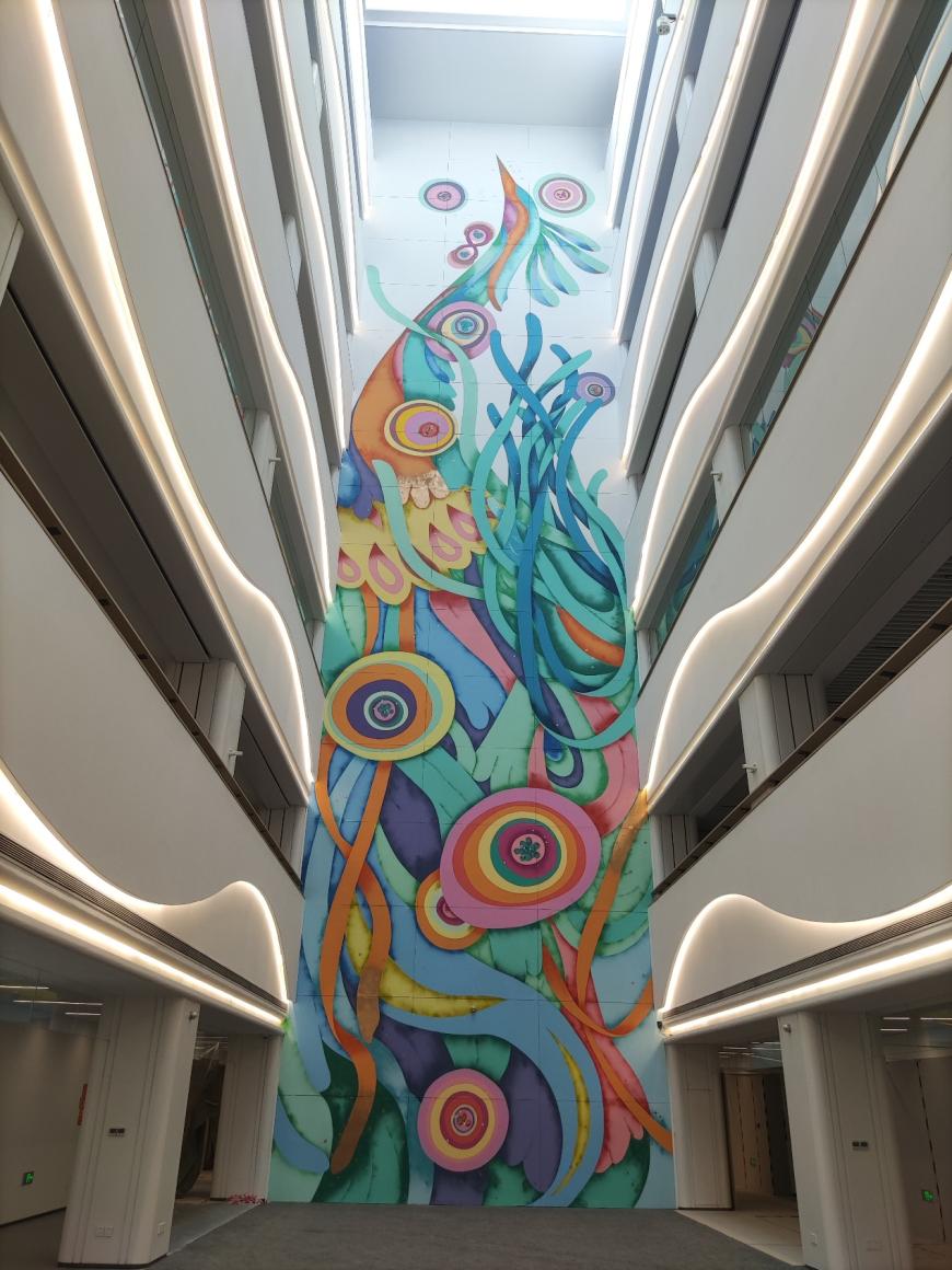 据杨莉介绍,这幅“筑巢引凤”画作从4层一直贯穿到10层,“大家可以看到,它是没有画眼睛的,因为我们觉得创新本来就是一个探索的过程,它充满未知,但是令人向往,看见未看见,改变未改变,大家都走在未来可期的路上,而我们公司会陪伴着大家一起探索,一路同行。”