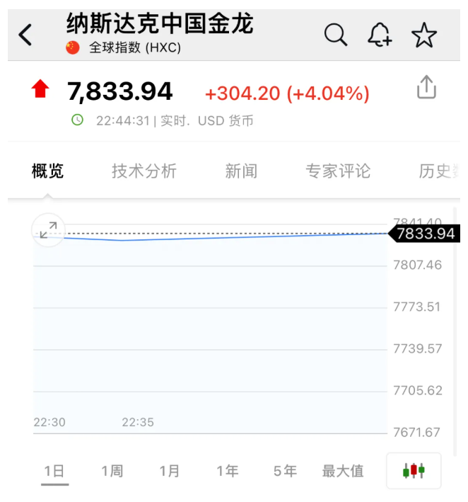中概股集体大涨,纳斯达克中国金龙指数暴涨4%,百度涨11.35%,富途控股涨6.84%,哔哩哔哩涨6.87%,网易涨6.77%,老虎证券涨5.54%,36氪涨4.85%,房多多涨4.79%,蔚来涨4.64%,阿里巴巴涨4.55%,霸王茶姬涨4.47%,腾讯控股ADR涨4.30%,新东方涨4.15%,微博涨3.82%,爱奇艺涨3.39%,理想汽车涨3.01%,高途涨3.02%,贝壳涨2.79%,迅雷涨2.82%,京东涨2.34%。