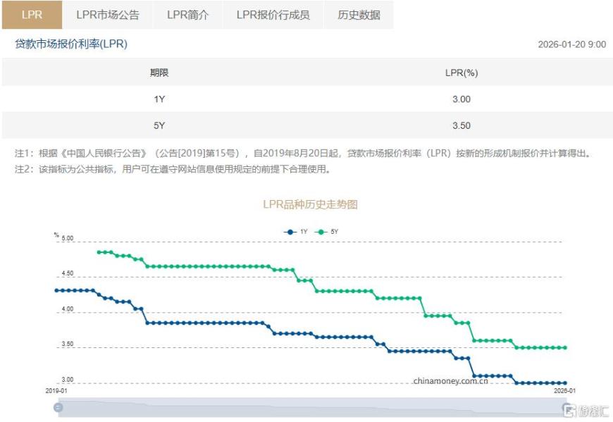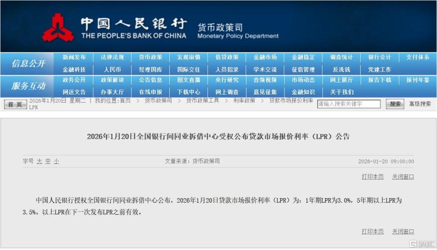 中国人民银行授权全国银行间同业拆借中心公布,2026年1月20日贷款市场报价利率(LPR)为:1年期LPR为3.0%,5年期以上LPR为3.5%。
