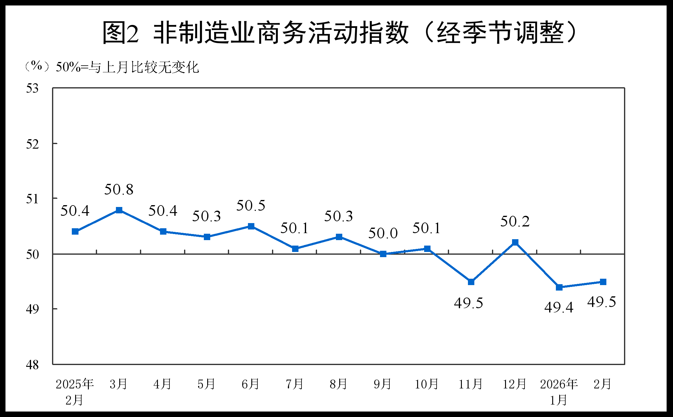 2月制造业PMI录得49%,比上月下降0.3个百分点,非制造业商务活动指数小幅回升