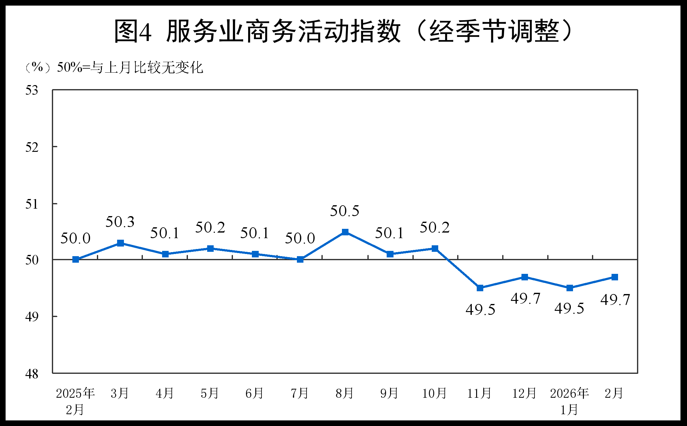 国家统计局服务业调查中心首席统计师霍丽慧解读2026年2月中国采购经理指数时指出,2月份,受春节假期等因素影响,制造业采购经理指数为49.0%,比上月下降0.3个百分点;非制造业商务活动指数为49.5%,比上月上升0.1个百分点;综合PMI产出指数为49.5%,比上月下降0.3个百分点。