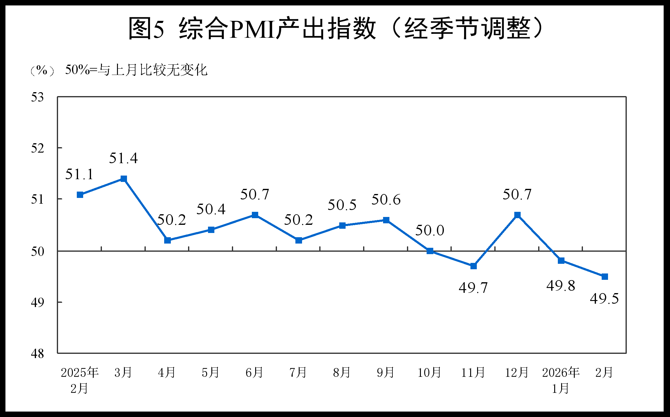2月份,综合PMI产出指数为49.5%,比上月下降0.3个百分点,表明我国企业生产经营活动总体较上月有所放缓。