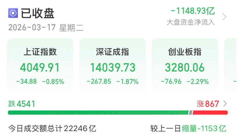 3月17日,A股市场延续调整,主要股指震荡收跌。截至收盘,两市超4500只个股下跌,日成交额降至2.22万亿元。市场热点主线不清晰,呈现快速轮动态势。
