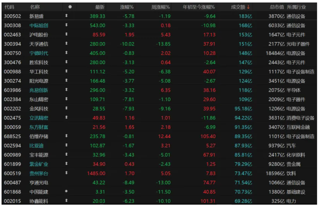 市场亏钱效应明显,867只个股收涨,涨停股52只;4541只个股收跌,跌停股15只。交易活跃股方面,收跌居多。CPO概念龙头股“易中天”均大跌,新易盛收跌5.78%报389.33元/股,中际旭创收跌3.33%报543元/股,天孚通信收跌10.02%报280元/股。电源设备个股阳光电源、金风科技跌幅较大,电子元件个股胜宏科技跌逾3%。