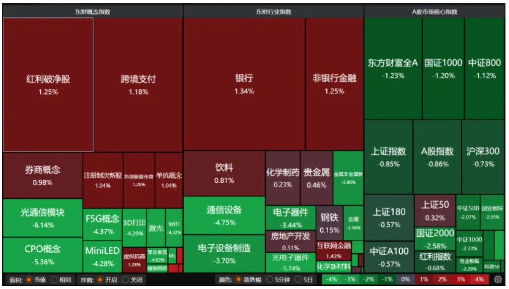 银行、券商、饮料板块护盘,科技股、资源股均熄火,光通信模块、电子设备制造、电子器件、金属、光电子器件等板块均大跌。