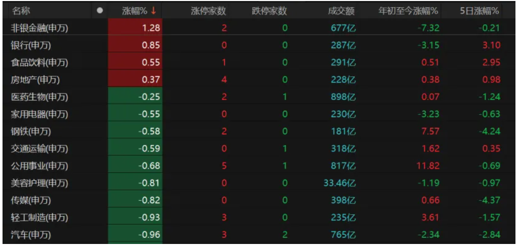 31个申万一级行业中,仅非银金融、银行、食品饮料、房地产板块逆市收红。
