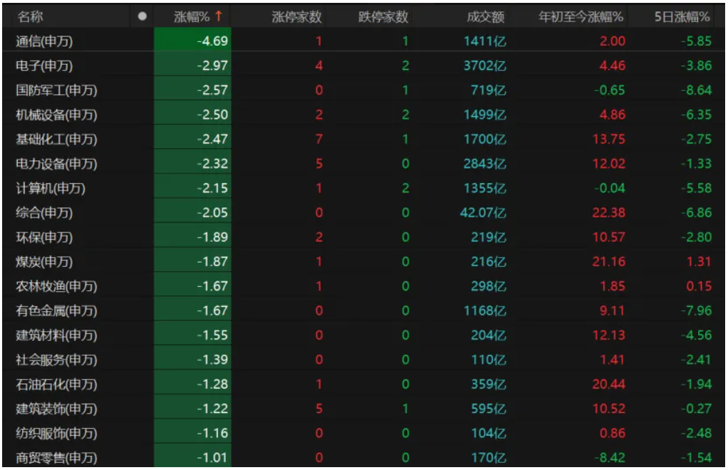 通信板块收跌4.69%,德科立、光库科技、长芯博创均大跌;电子、国防军工、机械设备、计算机等板块跌幅均超过2%,电力设备板块也大跌,基础化工、煤炭、有色金属跌幅也靠前。