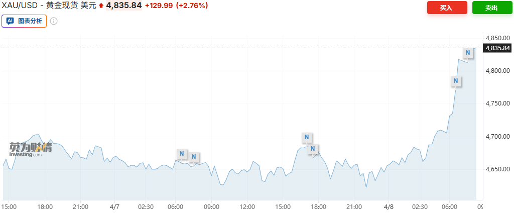 智通财经获悉,美国总统特朗普表示,他已同意停火两周,受此消息提振,金价上涨。特朗普在社交媒体上发文称,他已同意暂停轰炸伊朗,而就在不到两小时前,他自己设定了摧毁伊朗“整个文明”的最后期限。伊朗也同意霍尔木兹海峡暂时重新开放两周,油价暴跌,美元走软,支撑了金价。油价暴跌至每桶100美元以下。黄金现货交易价格一度上涨超过3%,突破每盎司4850美元重要关口,延续了前一交易日1.2%的涨幅。